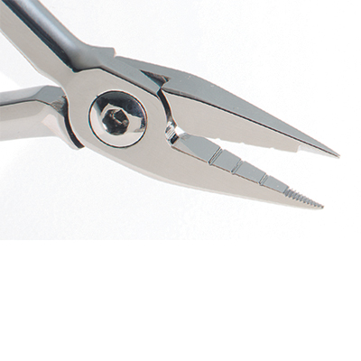 Jarabak tipi ark şekillendirme ve loop kapama pensi. Hassas yivli çeneler ince tel bükümlerinde kayma önler. 0,020″ kalınlığa kadar ince tel.