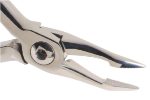 Uzun kama uçlu posterior bant çıkarma pensi. Uzun ve dar uç, derin posterior bantlara kolay erişim sağlar; plastik yastıklı karşı uç.